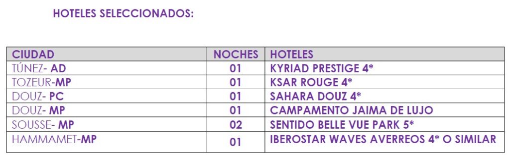 Salidas desde BCN O MAD con el vuelo Tunisair clase turista. Asistencia y traslado al hotel 4*. Alojamiento
